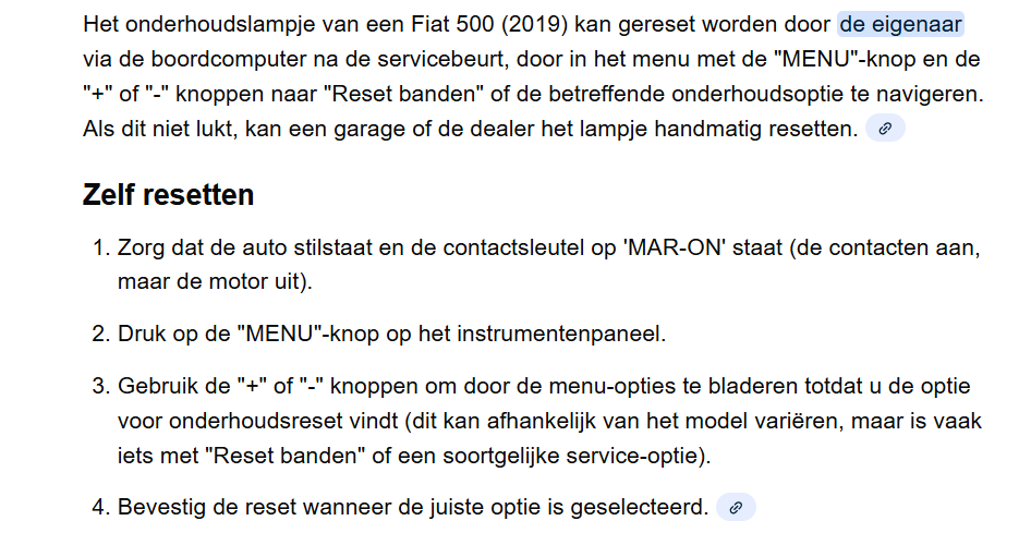 Bij mijn Fiat 500X (2019, 1.0 Firefly benzine) is het onderhoudslampje gaan branden nadat ik problemen had met de accu.