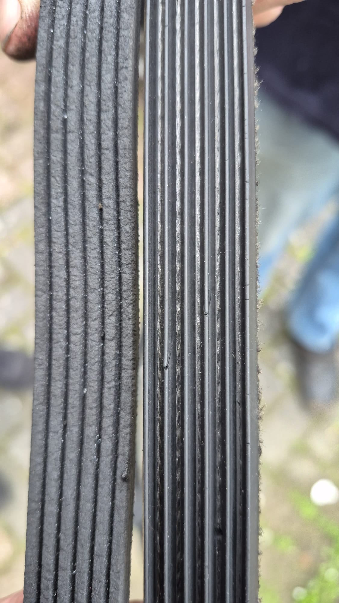 Als ik de ribbels van de oude multiriem bekijk dan zie je dat deze een V-vorm hebben terwijl de ribbels van de nieuwe multiriem gewoon recht zijn, zie foto.