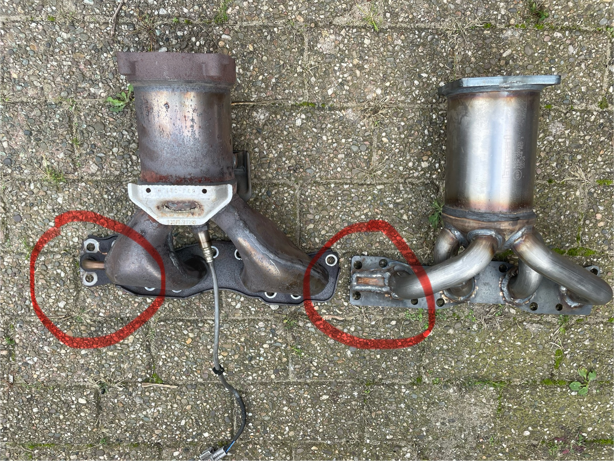 De originele katalysator heeft een klein buisje lopen vanuit het spruitstuk.
