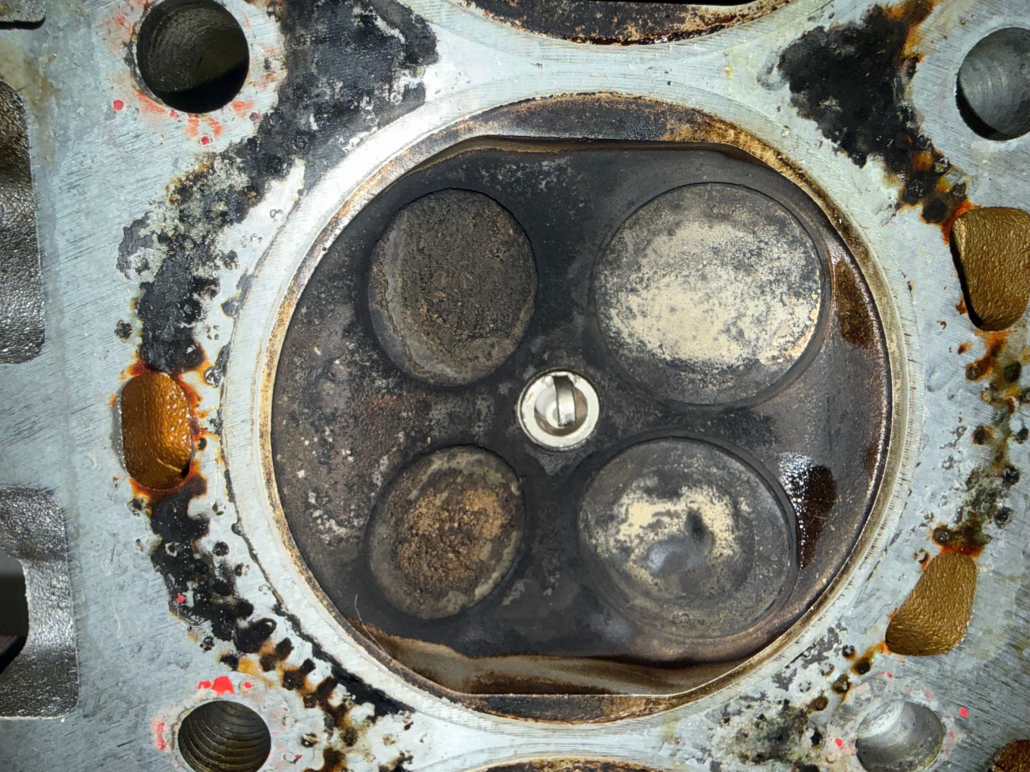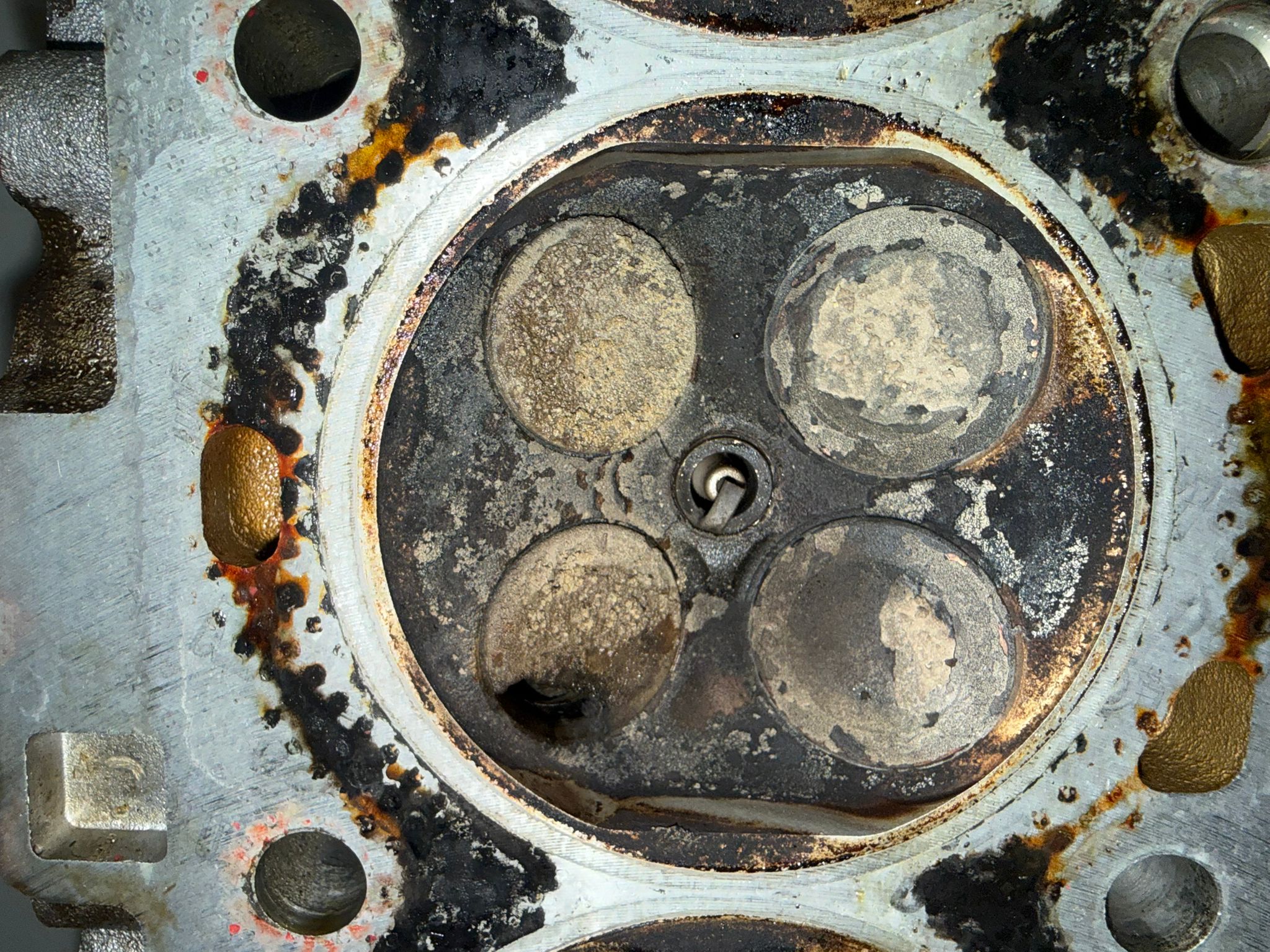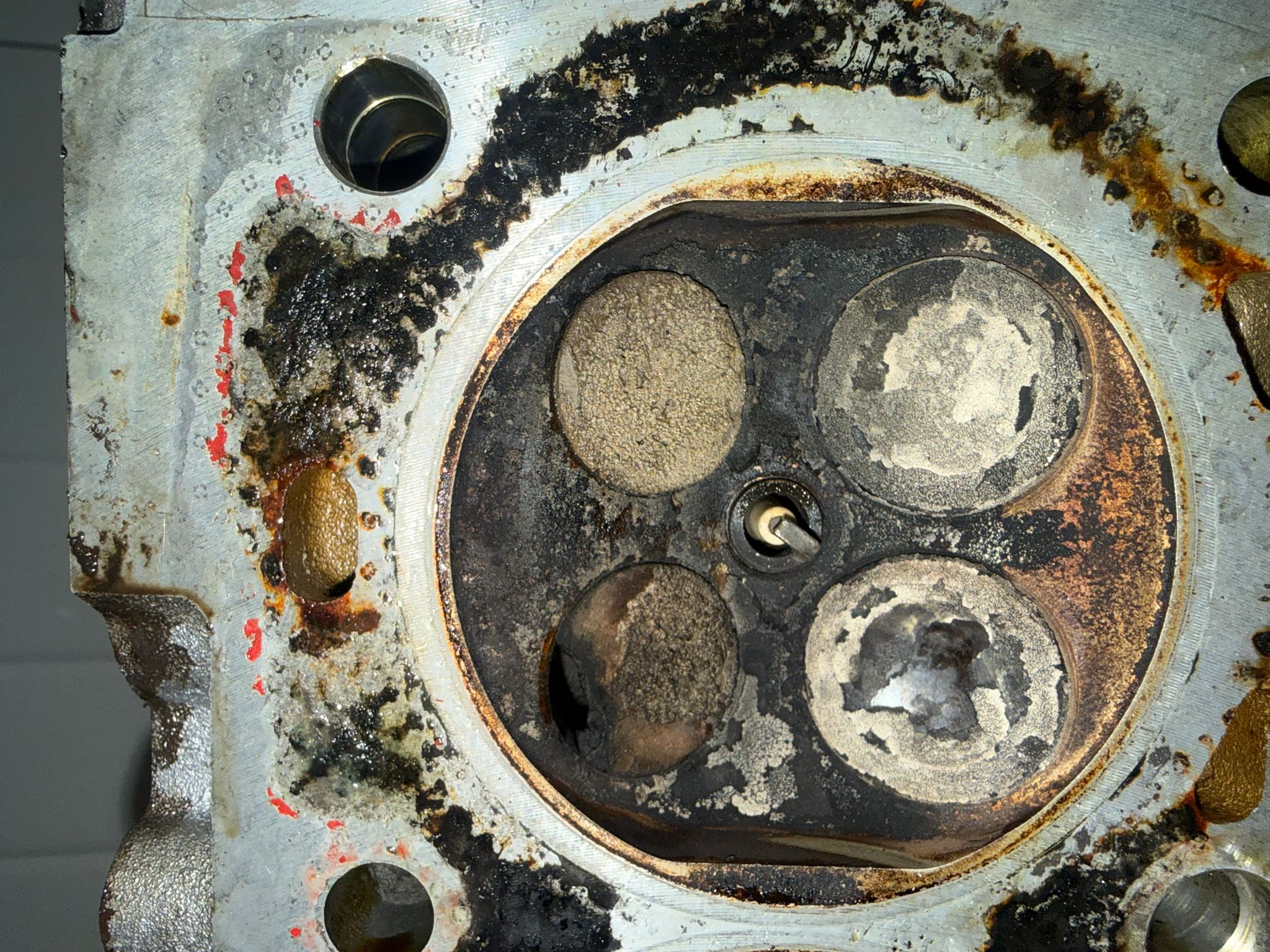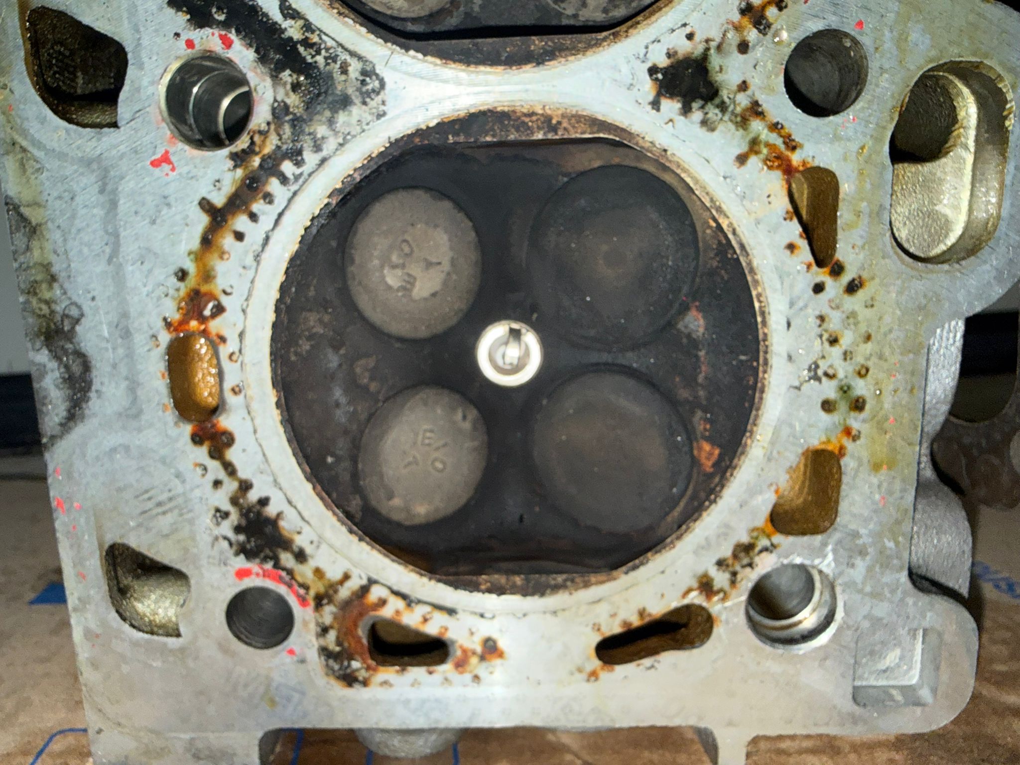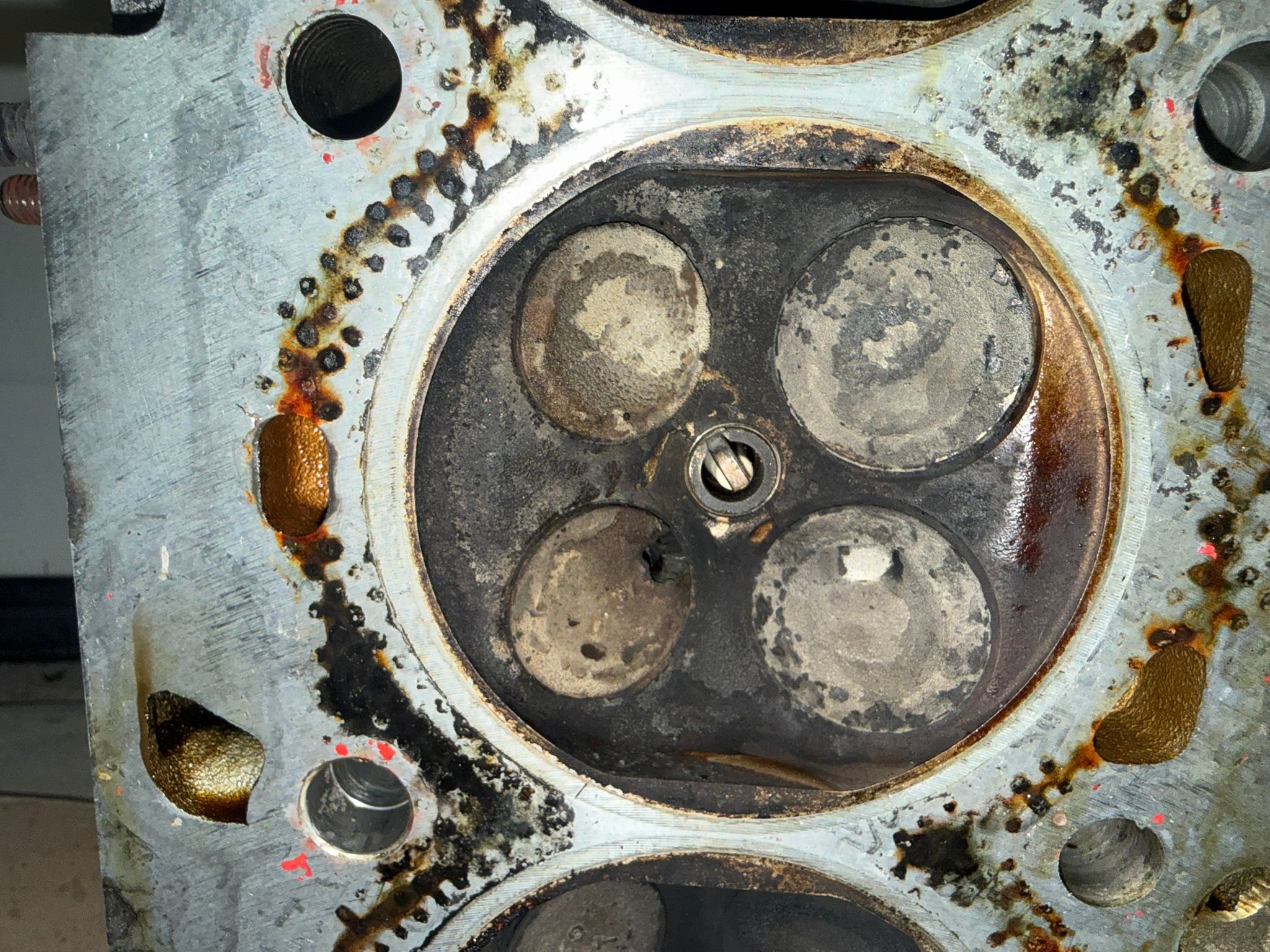 Je kunt nog een lektest doen maar vrees dat de kop er af moet , zuigers / cilinderwand misschien ook beschadigd , een bougie die opgevreten wordt en 0 compressie tja.