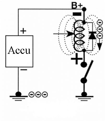 Daarom worden er tegenwoordig relais gemonteerd voorzien van een diode. Dit is te zien op de behuizing.