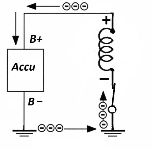 Het zit anders want de elektronen stromen nog steeds van Min naar Plus en de energie van het Elektro-Magnetisch Veld die moet worden afgevoerd. zorgt ervoor dat de elektronen vanaf de Minkant van de spoel door het hele circuit, over de geopende schakelaar, naar de Pluskant van de spoel gaan. Met de bekende vonkvorming over de schakelaar.